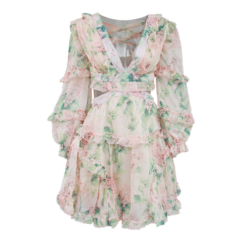 Deep V-Neck Floral Mini Dress – Backless, Long Sleeve